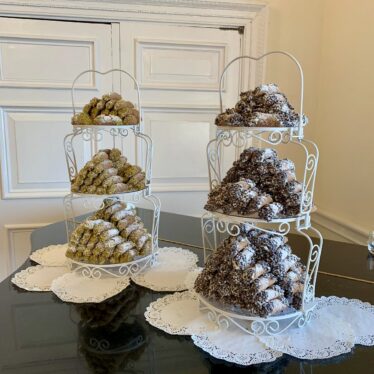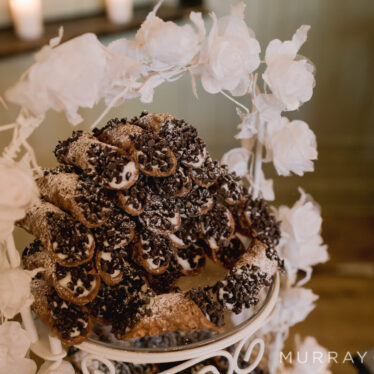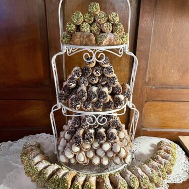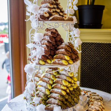 The Cannoli Tower is our signature centrepiece: a spectacular multi-tiered display of golden, crisp Sicilian cannoli filled with smooth, creamy ricotta.
